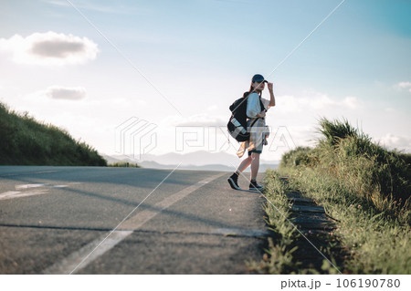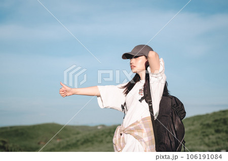ヒッチハイクする女性モデル