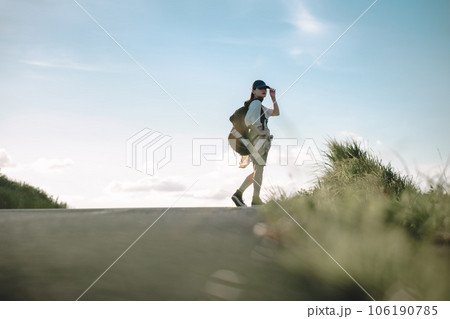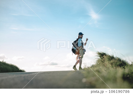 道を歩く女性バックパッカー