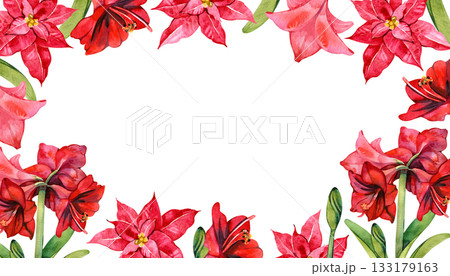 Watercolor amaryllis floral frame with vibrant red flowers. Elegant botanical border for Christmas cards, invitations, festive greetings, wedding stationery and seasonal design projects.