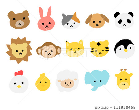 子どもがクレヨンで描いたようないろいろな動物の顔の手書き風イラストセット(ベクター版)