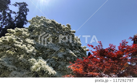 青空とまるで雪の白とモミジの赤のコラボレーション