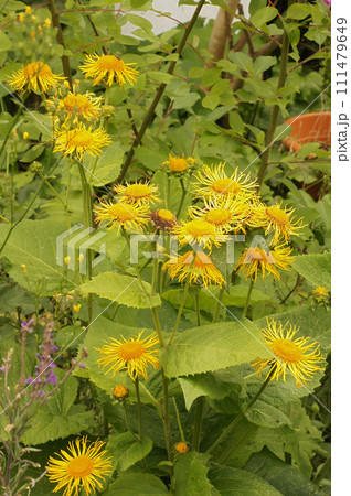 Vertical closeup on a yellow flowering Elacampane, Inula officinalis, plant in the garden