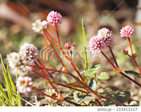 ピンク色の小さな花が球状に集まり、金平糖のような形のヒメツルソバ(姫蔓蕎麦)