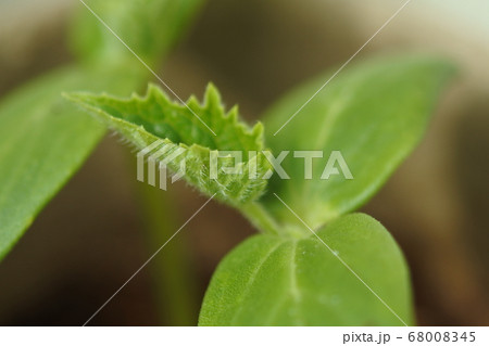 キュウリの本葉 双葉の間から本葉が伸びて来た
