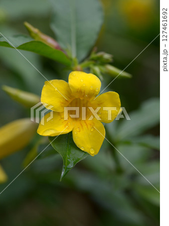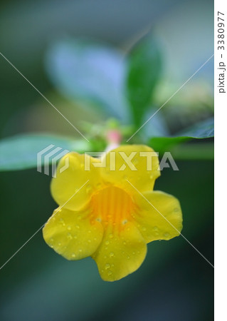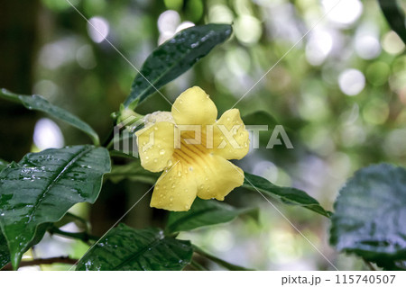 雨上がりで雨が水滴に 黄色い花 ヒメアリアケカズラ