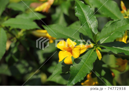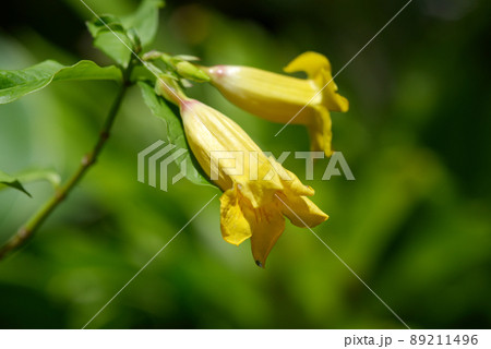 晴れた日 青空の下、鮮やかに咲く、黄色の花ヒメアリアケカズラ
