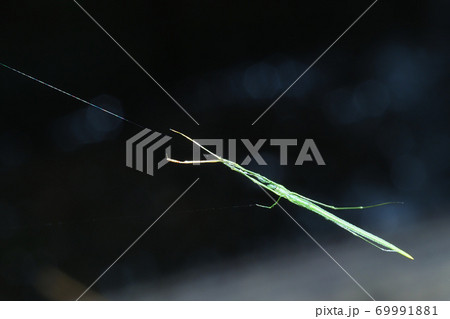 生き物 蜘蛛 オナガグモ、見事な擬態。枯れ落ちた松葉か細枝が蜘蛛の巣にかかっているように見えます