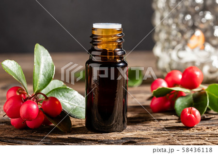 A bottle of wintergreen essential oil with fresh wintergreen berries