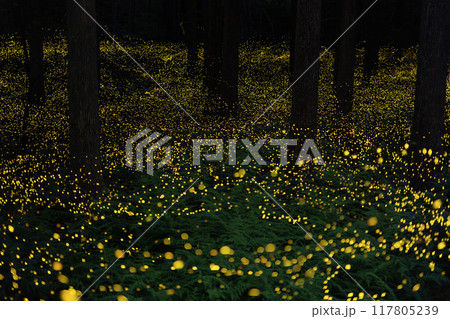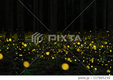 竹林と杉林を舞うヒメボタル。夏イメージ。