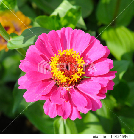 Vibrant Pink Zinnia Flower in Full Bloom with Golden Center Under Natural Light, Copy Space for Gardening and Floral Design Projects