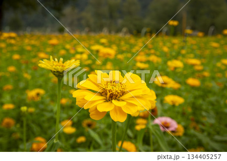 Zinnia Flower With Green tree on farm