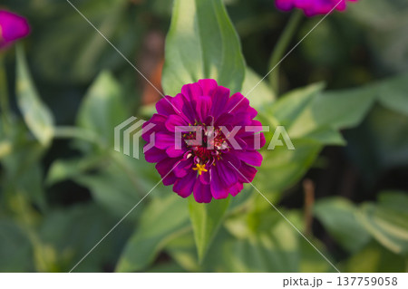 Zinnia bush with flower is growing in cottage garden. Annual or perennial herb. Blooming purple flower. Sunny day.
