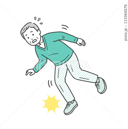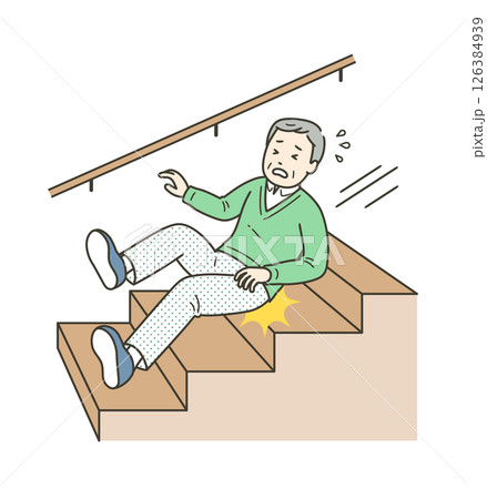 階段で足を滑らせて転落し尻もちをつく高齢男性