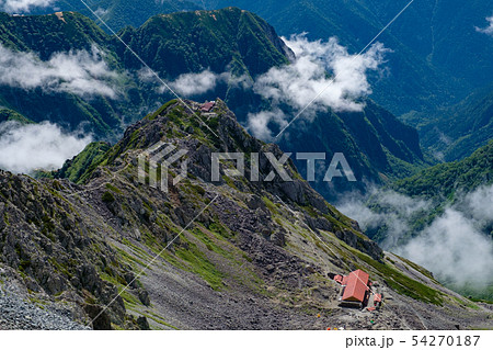北アルプス 槍ヶ岳山頂からの風景 ヒュッテ大槍越しに槍沢を俯瞰する