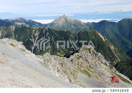 北アルプス 大喰岳山頂からの風景 槍ヶ岳山荘とテント場