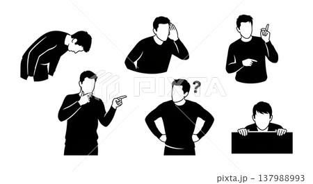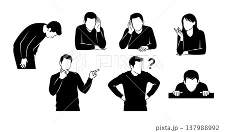 Black Solid Contemplative People Silhouettes Set of Six on White Background