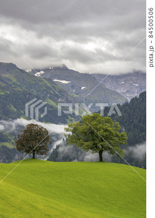 Lonely trees in countryside, Swiss Alps nearby Unterschachen