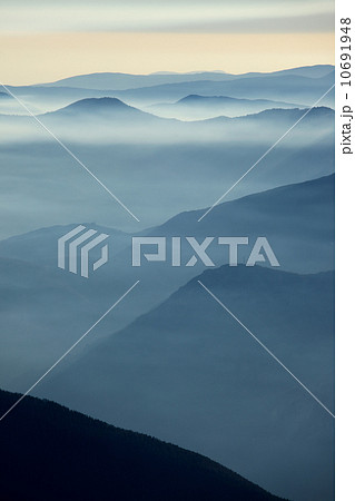 Scenic landscape of mountain valley in european Alps. Stunning view of mountains and valleys in sunset light