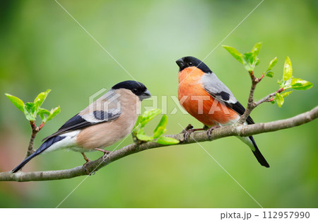 Little birds sitting on branch of tree. Male and Female common bullfinch