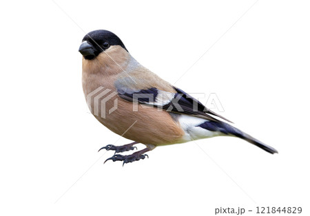 Male bullfinch sitting on branch isolated on white background. One cute bullfinch birds in wildlife nature. Eurasian bullfinch with red chest on tree branch, isolated with clipping path