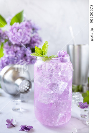 Lilac drink, infused drink from lilac flowers. Organic natural daikiri cocktail or mocktail, lilac lemonade with ice on a marble table. Copy space.