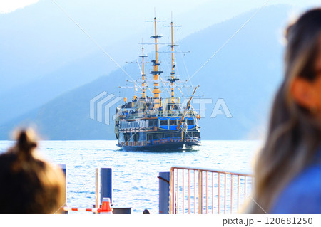 箱根・芦ノ湖 富士山を望む元箱根港に停泊中の箱根海賊船ビクトリー / Hakone, Japan