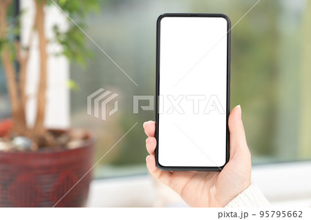 Mockup cellphone. Woman hand holding mobile phone with blank screen in modern office. hand holding smartphone with white screen in office
