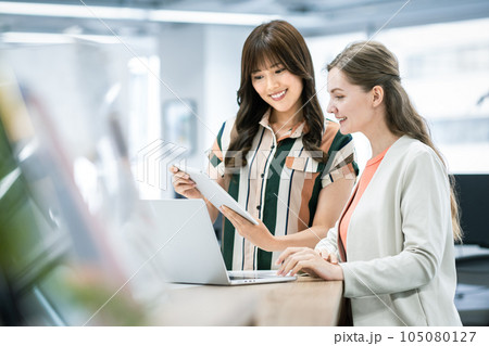 グローバルビジネス イメージ オフィスで話をするビジネスウーマン