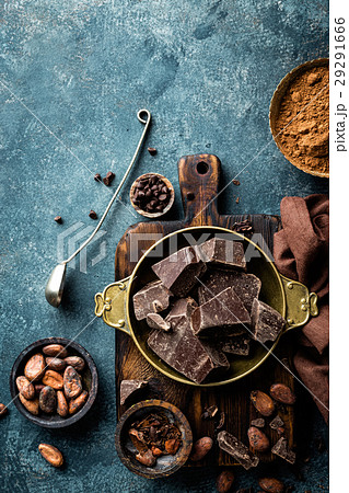 Chocolate pieces and drops, cocoa beans and powder on grey background
