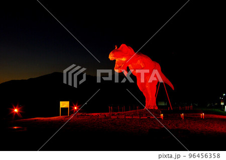 福井県勝山市 夕暮れに叫ぶピンク色にライトアップされたホワイトザウルス