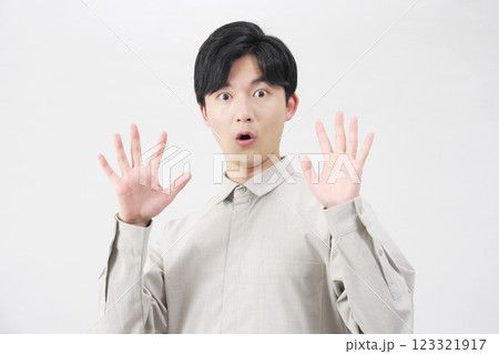 スマートフォンを持って驚く男性 白背景 カメラ目線