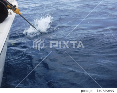 海面から釣り上げられる大物マグロの瞬間