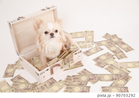 散らばったおもちゃのお札とトランクの中のクリーム色のロングコートチワワ