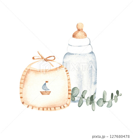 Newborn Boy Composition. Baby Bib with a boat, Bottle for milk and eucalyptus branch. Watercolor hand drawn illustration of cute Infant accessories in eco style. For invitations, Gender party, Baby