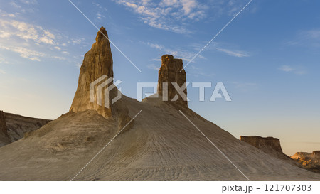 カザフスタン・マンギスタウ 西日に照らされるボズジラの岩山 Bozjyra, Kazakhstan