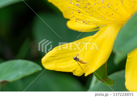 鮮やかな黄色のビヨウヤナギと花びらで休むアブ