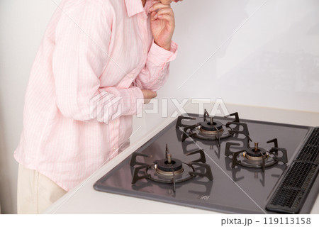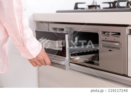 キッチンのビルトインガスコンロとグリルを見るミドル女性