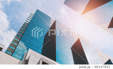 Modern sustainable glass office buildings. Exterior view of corporate headquarters glass buildings architecture.Glass windows in energy-efficient buildings. Financial business center buildings.