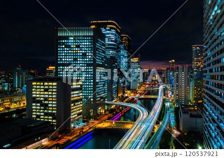 大阪中之島の超高層ビル群と阪神高速の夜景