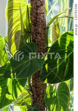 Philodendron plant support homemade sphagnum moss pole and plastic fine-mesh garden netting at home