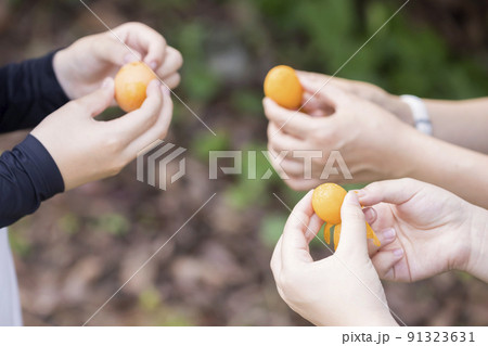採れたての枇杷を食べる親子手元 びわ狩りイメージ