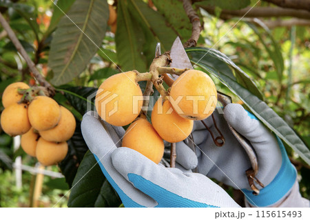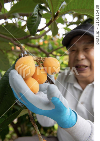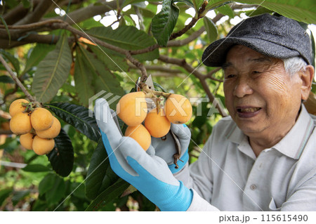琵琶の収穫をする果樹農家の男性、日本の農家