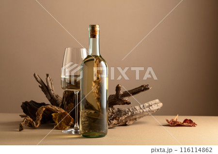 Elegant Still Life of White Cosmetic Bottle with Flowers and Towel on Beige Background