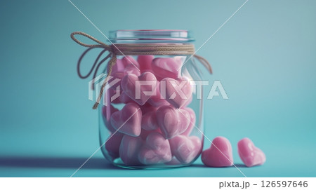 Love shape candy gum on glass jar sweet snack for kids on blue background