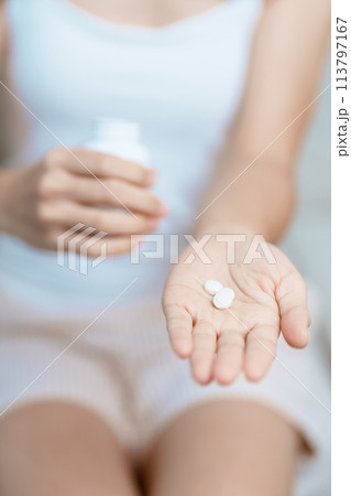 woman hand holding medicine painkiller pill on the sofa at home, taking for headaches, stomach ache, Diarrhea Pain from food poisoning, Endometriosis, Hysterectomy and Menstrual