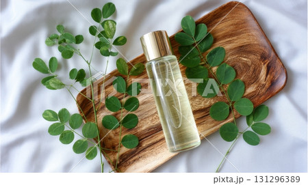 Flat lay mockup of eco-friendly skincare product with moringa oil, leaves, and wooden accessories.