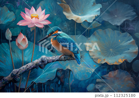 池にいるカワセミとハス
