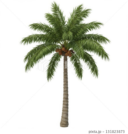 Single Coconut Palm Tree with Green Leaves and Brown Coconuts on White Background