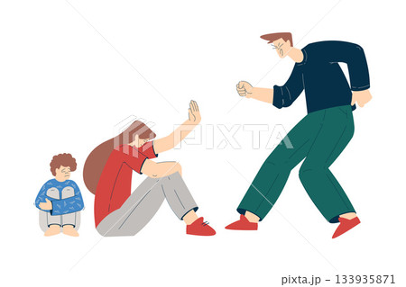 Irritated man beating his wife and kid with his