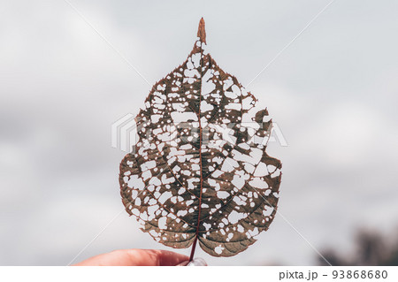 isolated image of an actinidia leaf with holes eaten by caterpillars